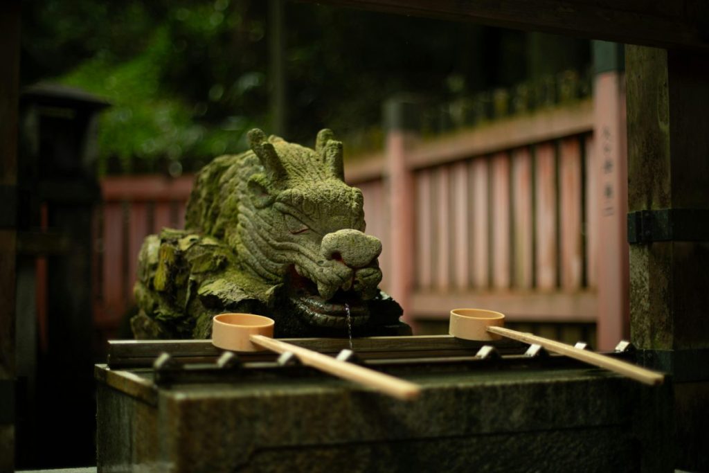 くしふる神社の大鳥居をくぐった先では、手水舎の龍さんがお出迎えしてくれます。